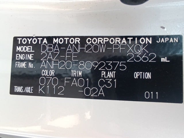 CHASSIS NO. | ANH20-8092375 |
